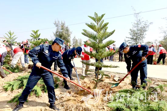 近日,揭阳海警局组织执法人员到惠来县神泉、靖海两地,联合当地有关单位干部职工和志愿者开展义务植树活动,以“海警蓝”为海岸添绿,用实际行动筑牢海洋生态屏障。