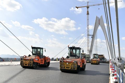 京灶大桥项目主桥沥青路面摊铺施工有序推进。