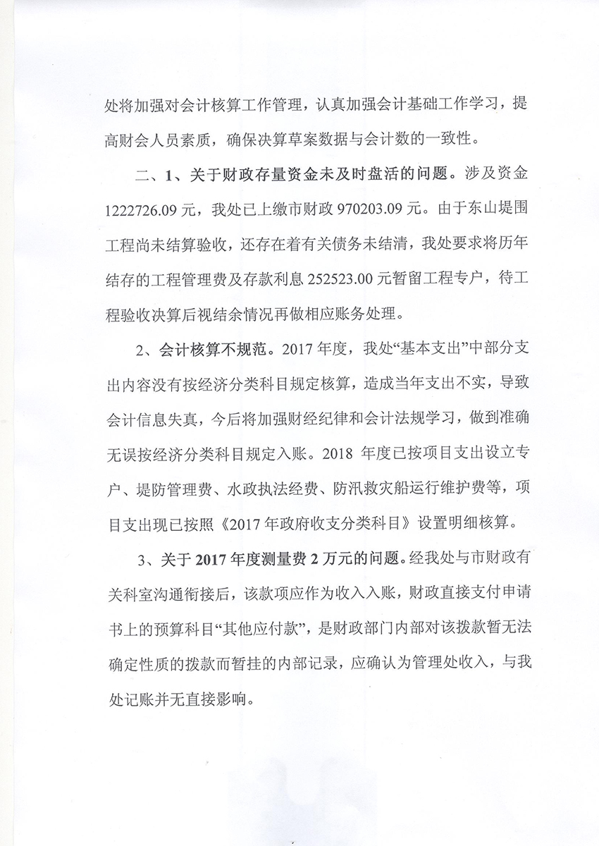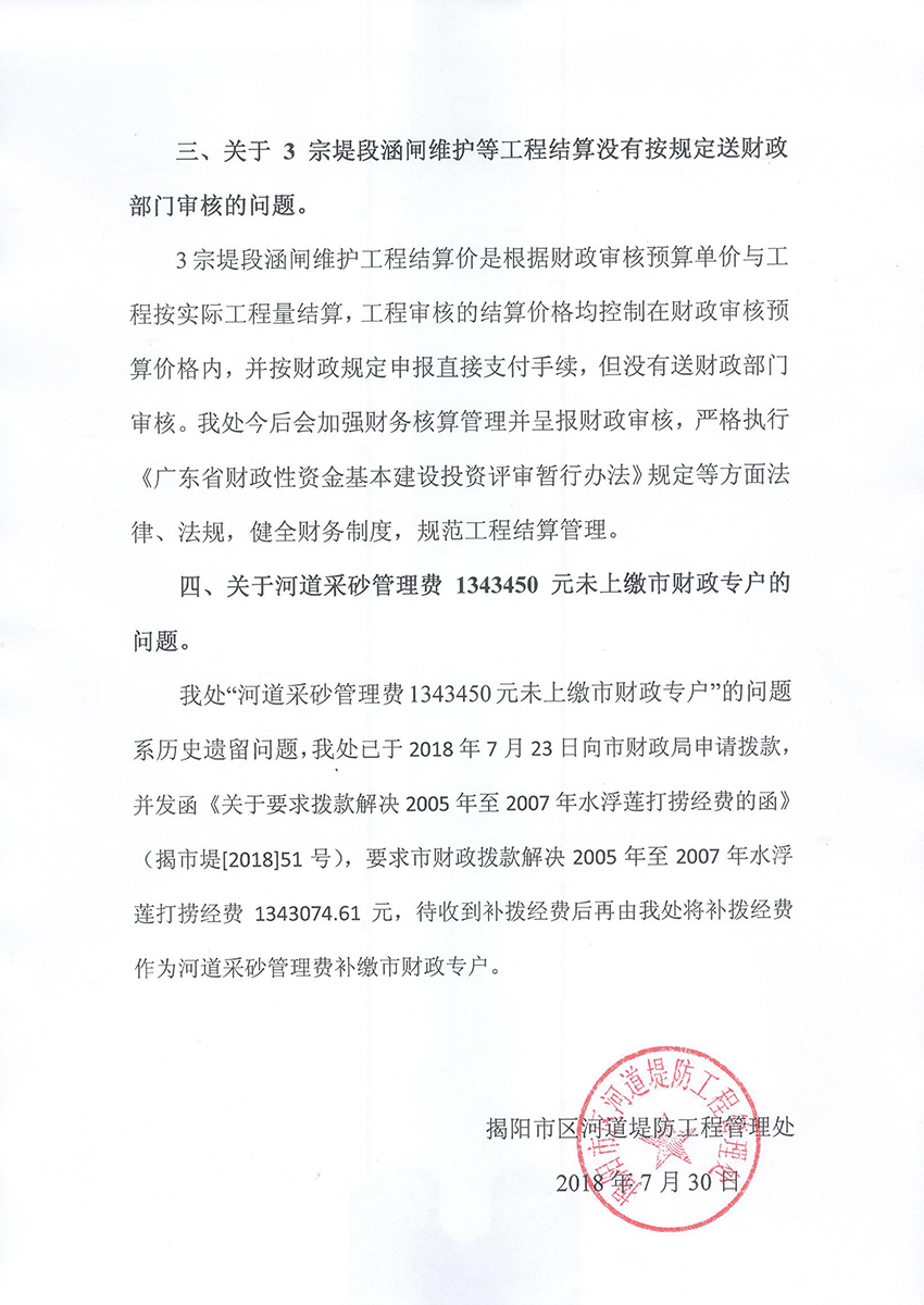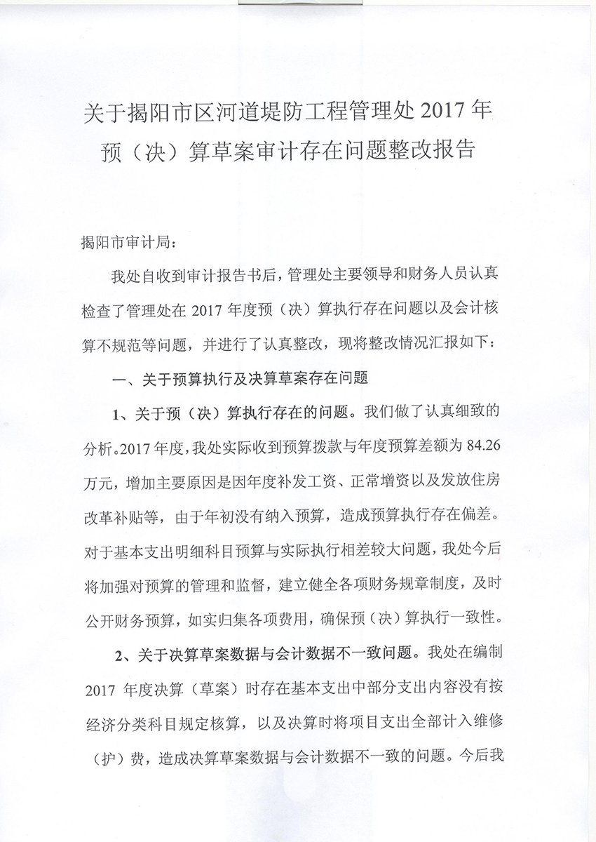 关于揭阳市区河道堤防工程管理处2017年预(决)算草案审计存在问题整改报告