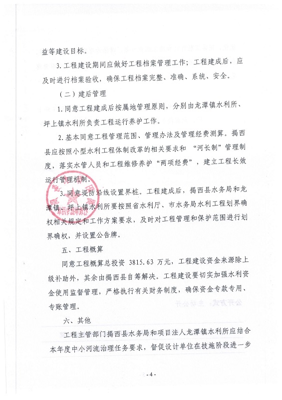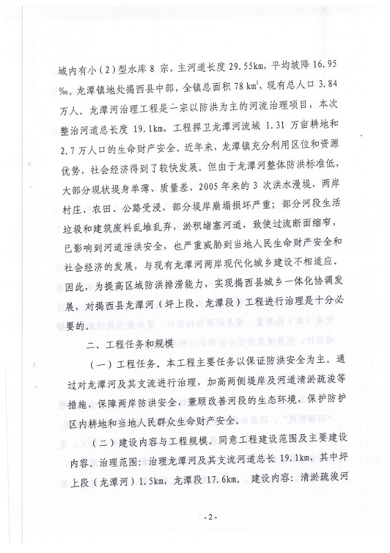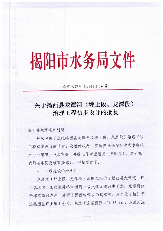 关于揭西县龙潭河(坪上段、龙潭段)治理工程初步设计的批复