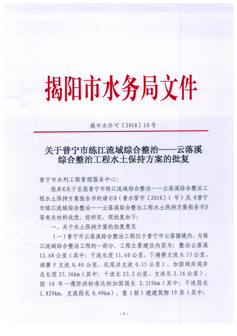 关于普宁市练江流域综合整治——云落溪综合整治工程水土保持方案的批复