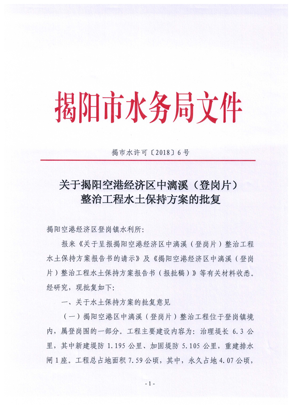 关于揭阳空港经济区中漓溪(登岗片)整治工程水土保持方案的批复