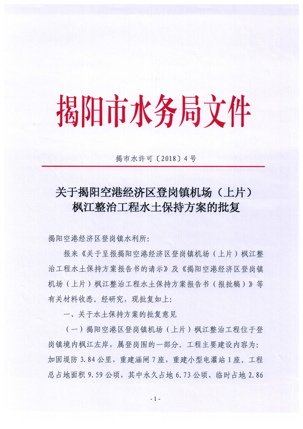 关于揭阳空港经济区登岗镇机场(上片)枫江整治工程水土保持方案的批复