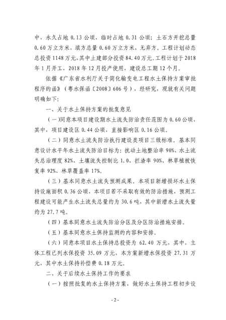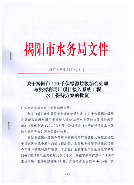 关于揭阳市110千伏绿源垃圾综合处理与资源利用厂项目接入系统工程输变电工程水土保持方案的批复