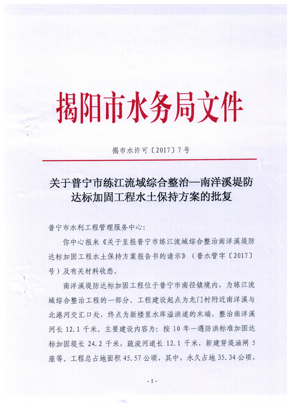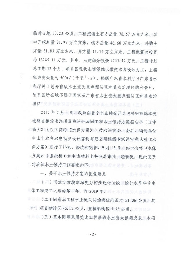 关于普宁市练江流域综合整治-南洋溪堤防达标加固工程水土保持方案的批复