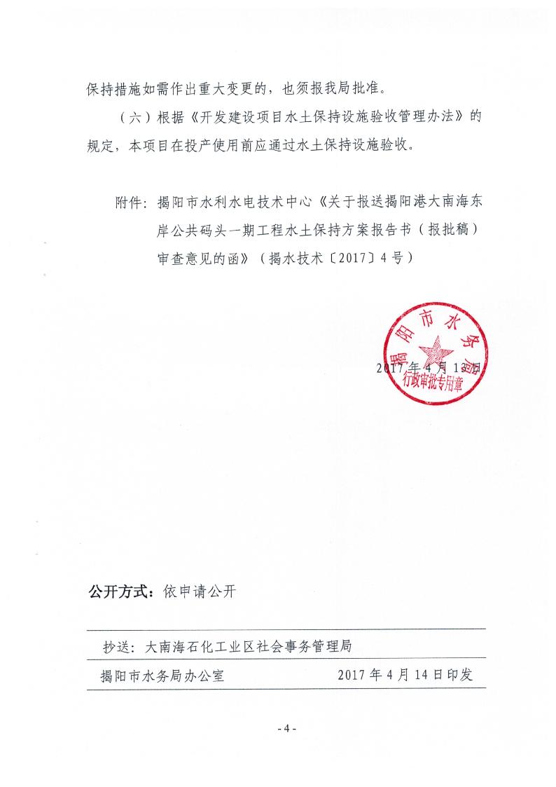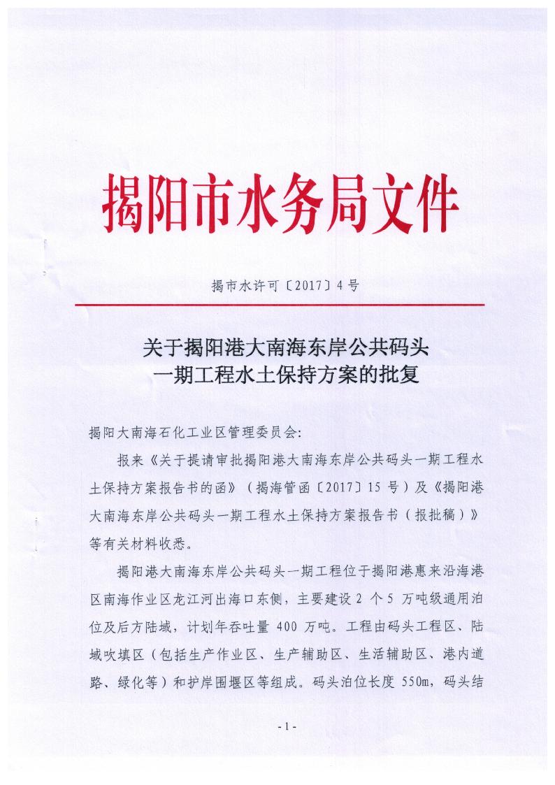 关于揭阳港大南海东岸公共码头一期工程水土保持方案的批复