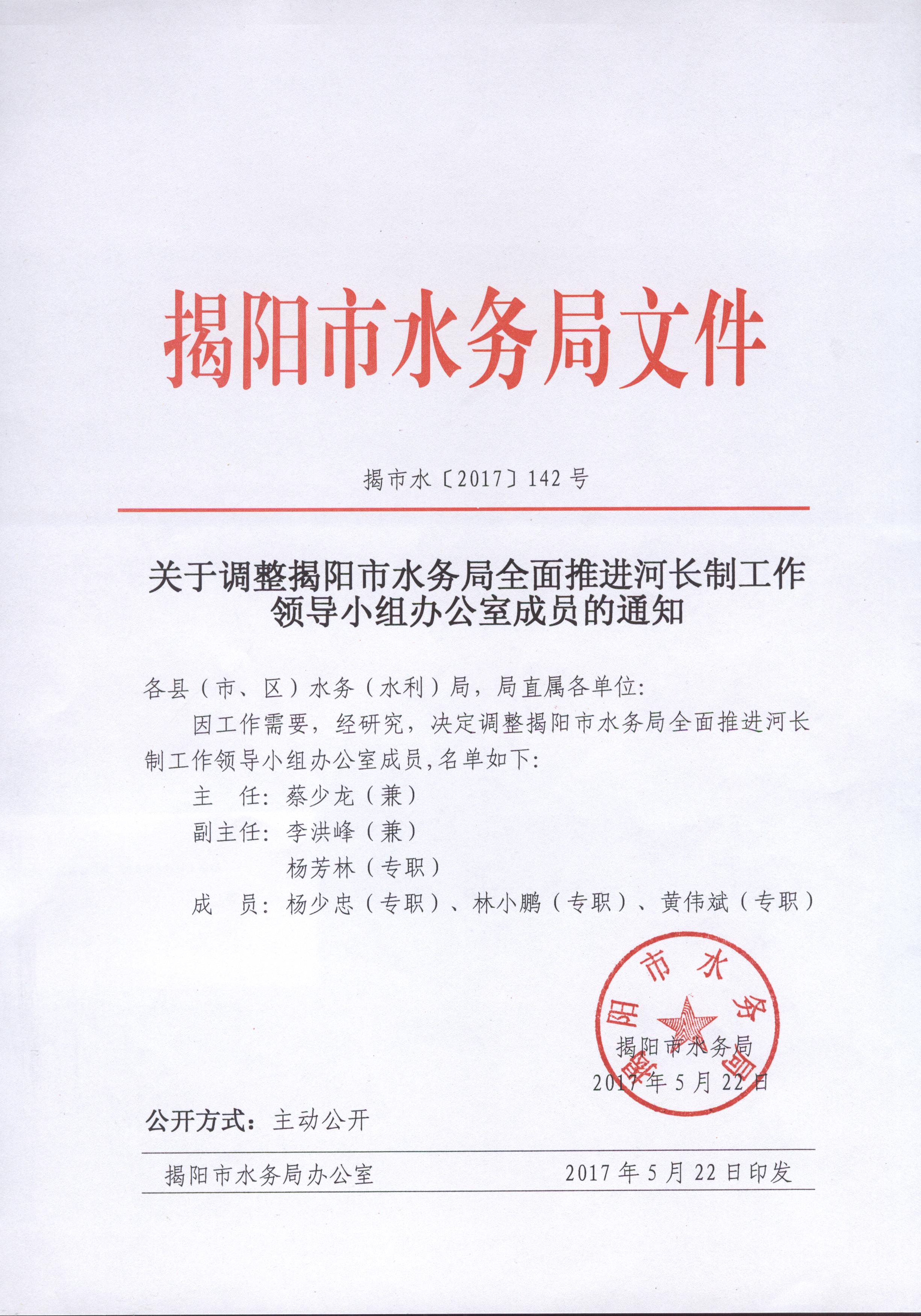关于调整揭阳市水务局全面推进河长制工作领导小组办公室成员的通知