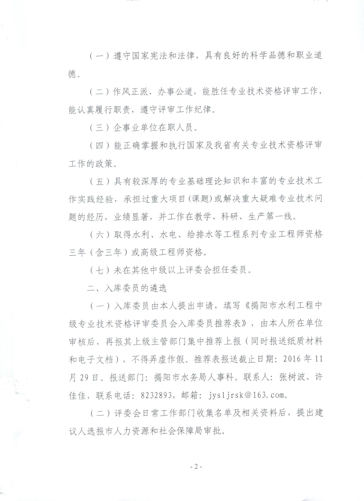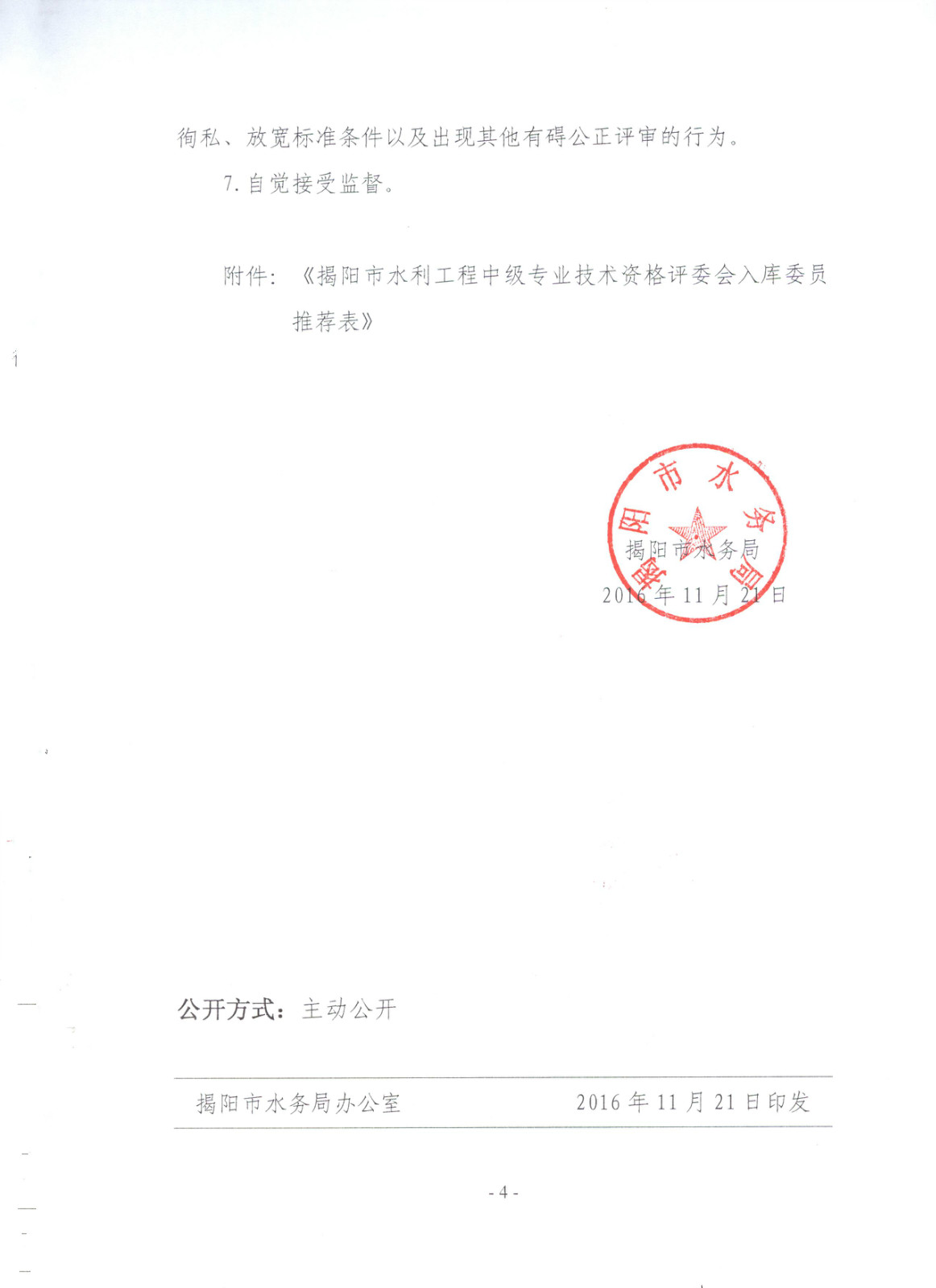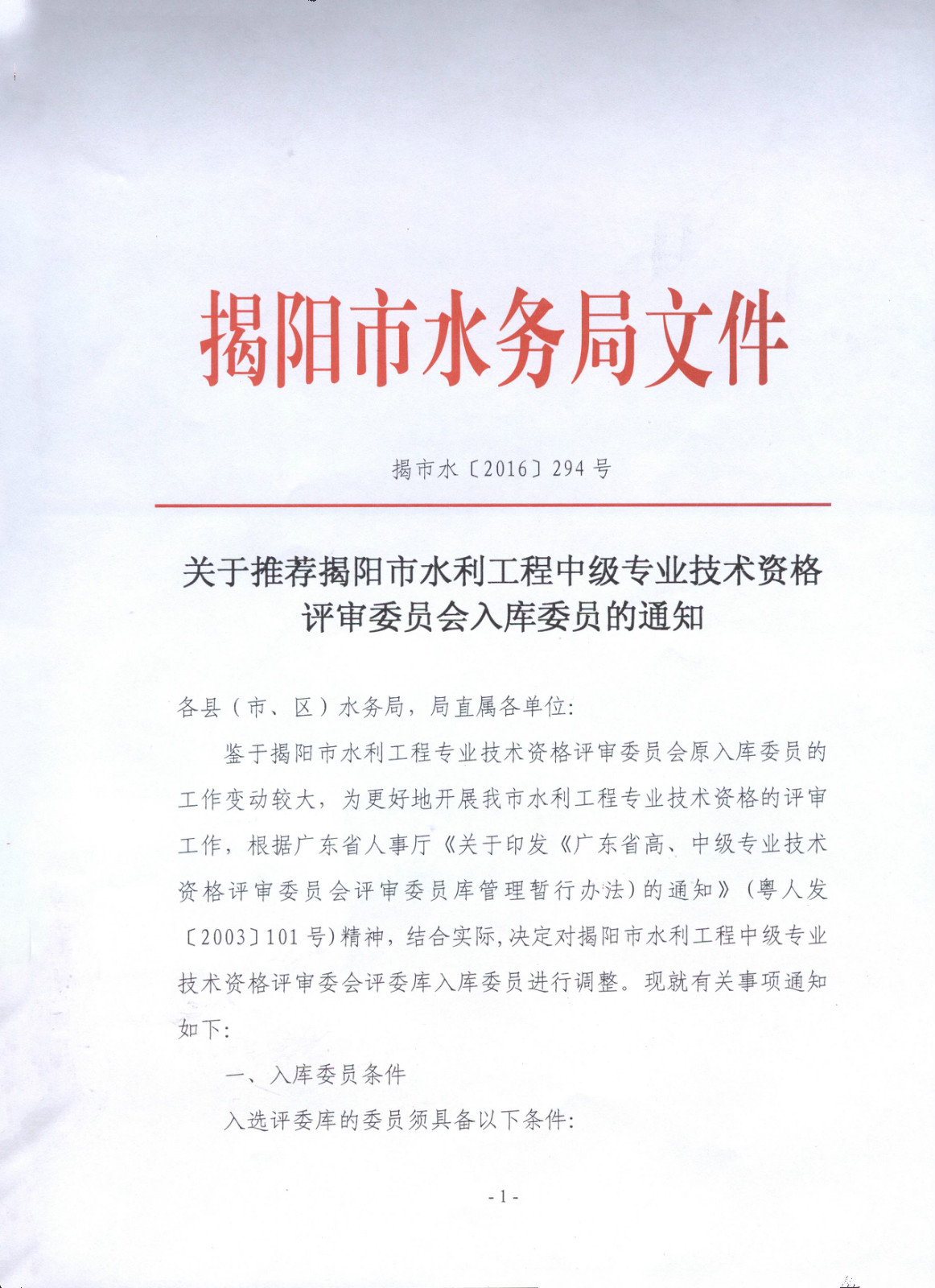 关于推荐揭阳市水利工程中级专业技术资格评审委员会入库委员的通知