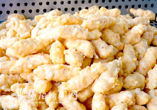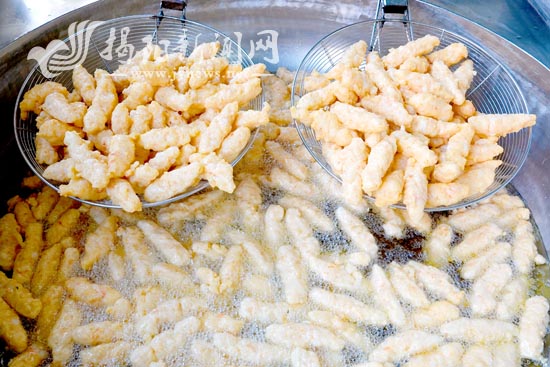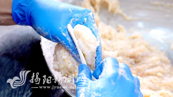 在生产现场,记者看到同为惠来虾枣县级非遗代表性传承人的詹泽新左手握虾浆,从虎口挤出,右手持勺柄迅速刮下,一个个两头尖的虾枣便成型了,似梭形,像枣核。“这种形状炸的时候容易熟,刮起来也快。”林创城说,这看似简单的动作,却需要长时间练习才能做到大小均匀。