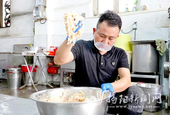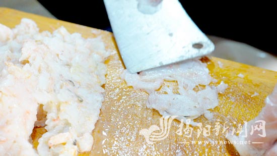 “接着将虾浆进行反复摔打,这个环节直接决定虾枣的口感。一般来说,要将虾浆反复摔打,直到它粘在手上反手不掉,这样做出来的虾枣口感便是最好。”林创城介绍。