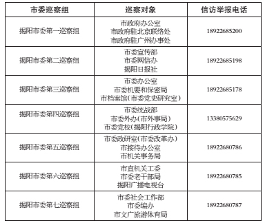 进驻期间,市委各巡察组专门开通值班电话、意见箱和邮政信箱,受理具体问题反映(受理时间为工作日上午8:30-12:00、下午2:30-5:30)。邮政信箱:揭阳市榕城区临江北路市机关大院1号楼911室转市委相关巡察组收。其他不属于巡察受理范围的信访问题,将按照分级负责、属地管理的原则,移交被巡察单位和有关部门认真处理。