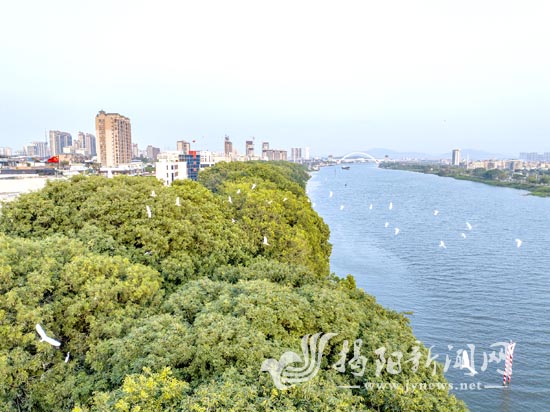 榕江北河两畔芳草如茵,清澈的江水碧波荡漾,白鹭逐水嬉戏,悠然游弋。