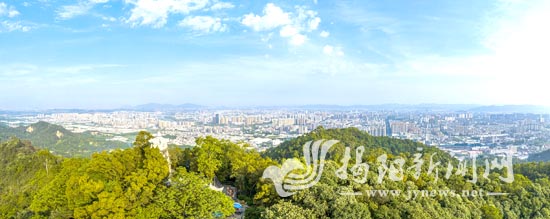 俯瞰黄岐山风景区,层林叠翠,风光怡人。